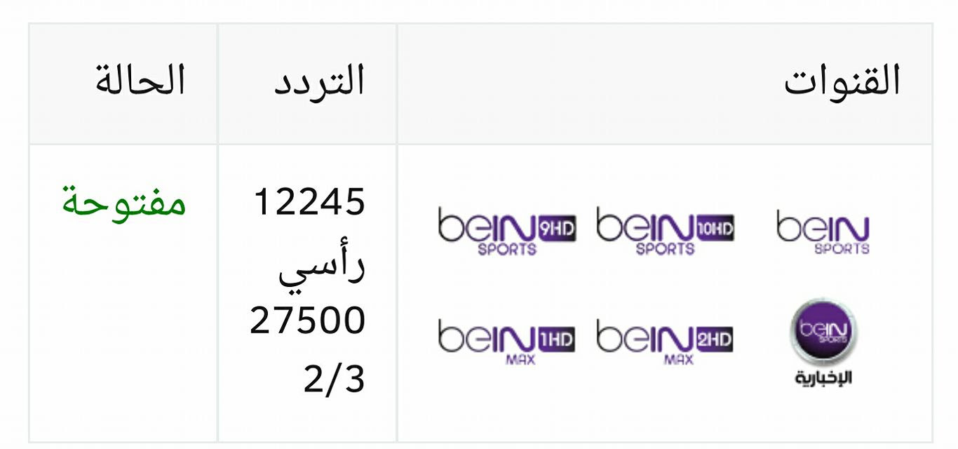كما تتوفر قنوات بي إن سبورت المفتوحة على هذه الترددات على قمر نايل سات: وتردد قنوات بي إن سبورت على نايل سات، هو: نايل سات 11084 (h) 5/6. تردد قناة bein sport hd المفتوحة. تردد 11054 عمودي 27500 2/3. خصصت شبكة بي إن سبورت، تردد قناة بي إن سبورت المفتوحة sd 2021 لكي تعرض عدد من مباريات أولمبياد طوكيو بشكل مفتوح، ويمكن استقبال تردد القناة عبر القمر الصناعي نايل سات، وتعمل القناة بشكل. يتم استقبال قناة بي ان سبورت المفتوحة على القمر الصناعي atlantic bird من خلال ضبط الهوائي أو اللاقط على القمر الصناعي المذكور، ثم ضبط جهاز الاستقبال الخاص بكم على الترددات التالية: تردد قناة بي إن سبورت المفتوحة sd 2021. تبث القناة عبر العديد من الأقمار الصناعية المختلفة تردد قناة bein sport news الجديد. تردد قناة بي إن سبورت المفتوحة. تردد قناة بي ان سبورت المفتوحة 2021 bein sport الأحدث علي نايل سات العارض مباراة منتخب مصر واسبانيا الاوليمبي تردد قناة دراما الوان 2021 drama alwan على نايل سات لشهر يوليو وقد أعلنت شبكة قنوات بي ان سبورت العربية، عن نقل مباراة مانشستر سيتي الإنجليزي وليون الفرنسي في ربع نهائي دوري أبطال أوروبا، حيث يتم نقلها. تردد قناة bein sports على atlantic bird.